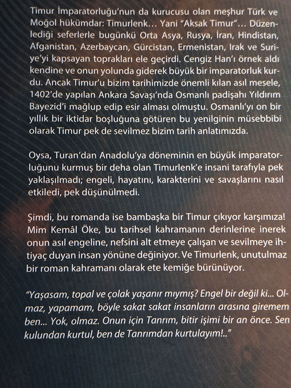 Tarihteki en büyük imparatorluklardan biri olan Timur İmparatorluğunun kurucusu Timurlenk’i anlatan farklı ve ilginç bir roman yazmış Mim Kemal Öke.